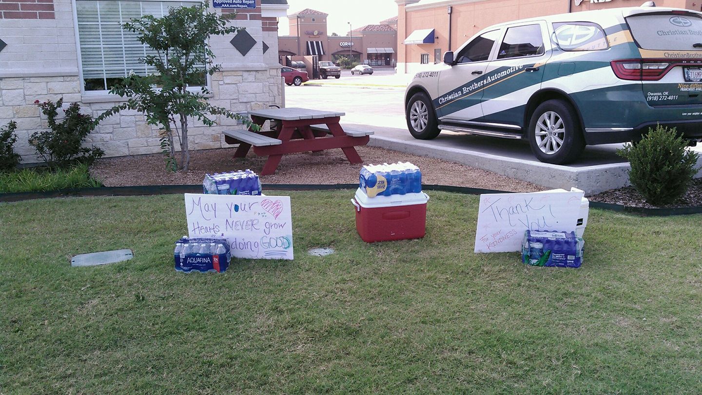 09/11/2017 – Earlier this month, the ice chest Christian Brothers Automotive Owasso provided for runners outside their business was stolen. When members of the community found out, they came together Sunday, dropping off cases of water and more ice chests to replace the one stolen.