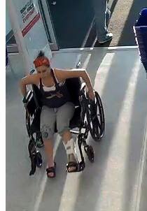 The female subject appears to be a white female, in her early 20’s, who is approximately 5’6” and 155 lbs. The female appears to have brunette hair, and attempts to disguise her identity by wearing glasses and using a wheel chair.