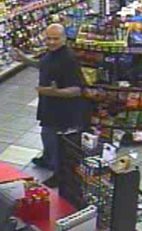 The subject is a heavy-set bald, or shaved head, male, approximately 6 feet tall with tattoos on both arms. The theft involved a grey pick-up truck with large vertical stripes on the tailgate.