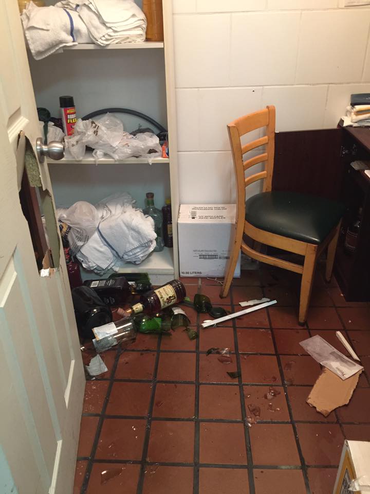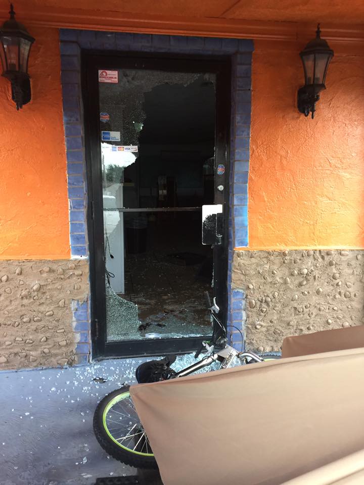 About an hour later, Mr Pancho’s restaurant on 76th Street North reported their front door shattered and items stolen. Their camera show a suspect riding up to the front door on a bicycle, and leaving on foot. They reported liquor bottles broken and up to $5,000 in cash stolen.
