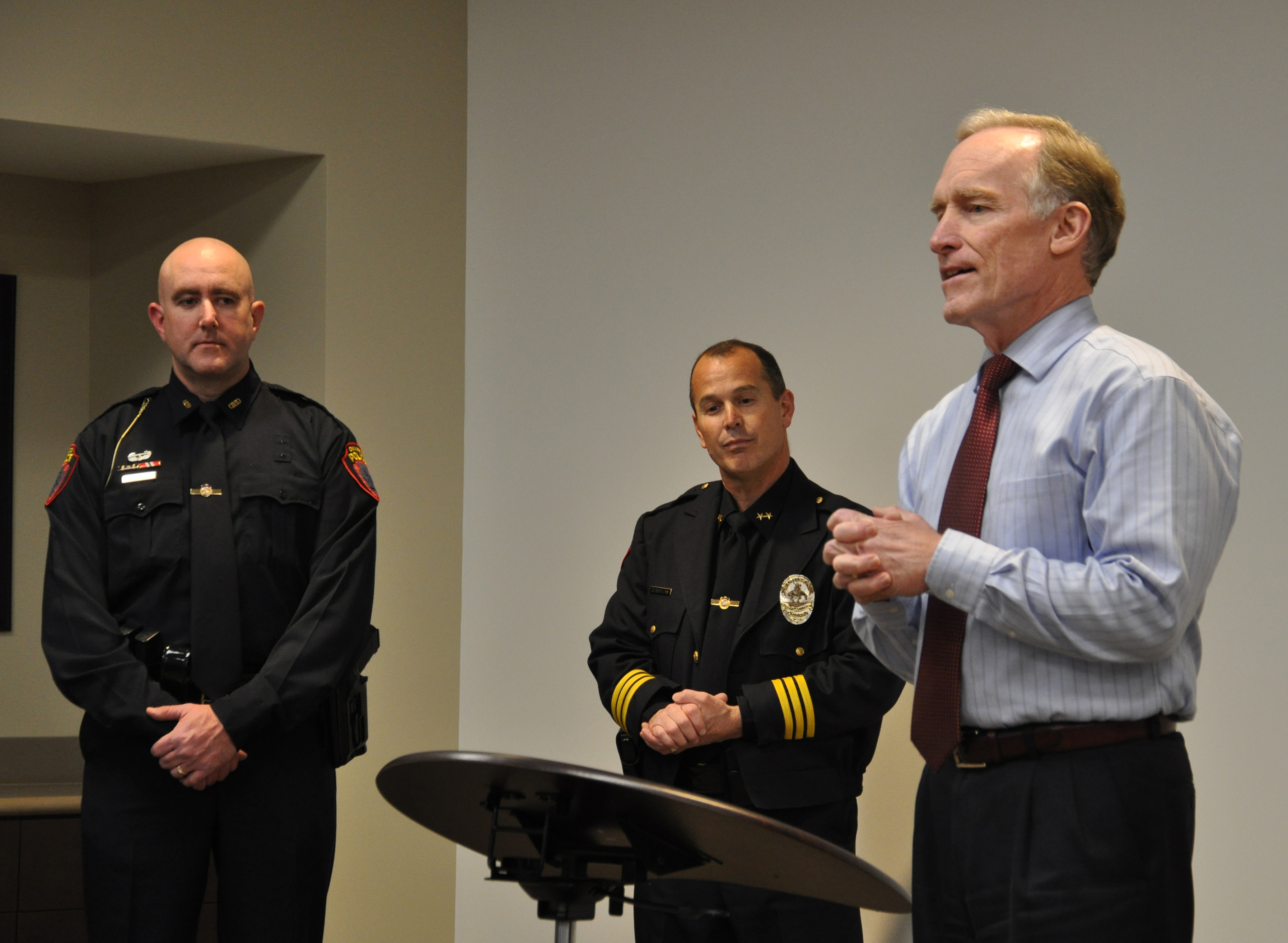 Owasso Police Chief Scott Chambliss give the Oath of Office to new officer Travis Harris